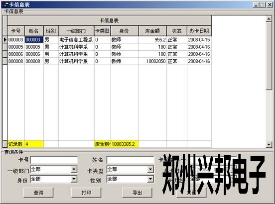 卡信息表主要用于查看卡的基本信息??梢赃x擇相應的條件,然后單擊【查詢】在表格中會出現相應條件的卡的基本信息,表的最下面顯示出所查詢出的總記錄數及庫金額匯總。