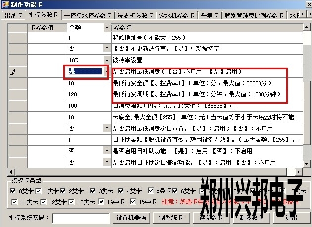 2)打開軟件 制卡中心-功能卡制作-水控參數卡中的最低消費周期,先選擇啟用,然后輸入最低消費金額和最低消費周期,最低消費金額以分為單位,最低消費周期以分鐘為單位,設置好后點擊制參數卡即可;