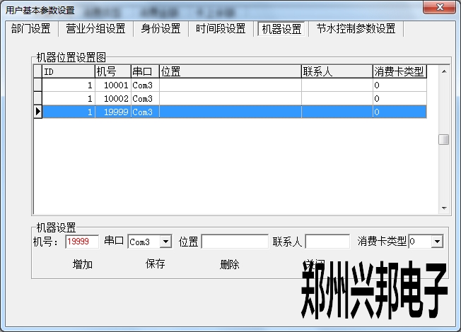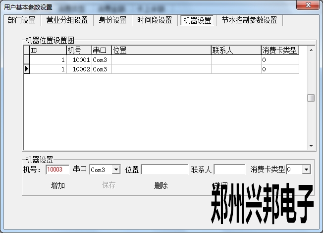在機器設置中可以添加機器,設置機器號、串口以及消費卡類型,位置、聯系人可以選填。其中設置機器號必須輸入5位,開頭為1,最大可設置為19999.串口是指通訊器連接電腦的端口號,此處的串口號選擇不正確的話會導致機器不通訊。