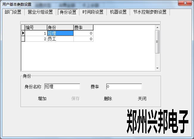 身份設置是對持卡人身份的說明,通過讀卡可以看到此人的身份。直接輸入身份名稱,費率填寫0,暫不起作用,點擊增加,增加成功后,選中信息進行雙擊可以對身份名稱進行修改,也可以刪除。