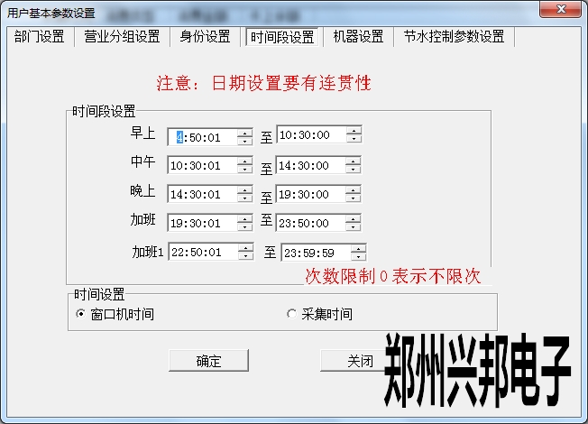 時間段設置是為了方便統計不同時間段餐別的消費情況。在設置時設置每個時間段之間不能交叉,不能跨天,時間由小到大進行設置。另外可以選擇窗口機時間和采集時間進行時間設置。窗口機時間是按照在機器上刷卡時形成消費記錄的時間;采集時間是按照機器聯機進行數據采集上傳的時間形成消費記錄的時間。點擊確定即設置成功。