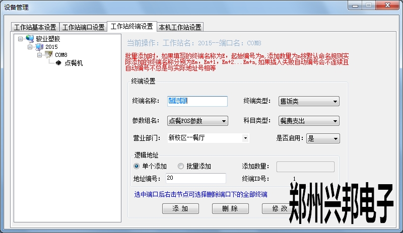 工作站終端設置:在端口地址下添加終端,進行添加時填寫終端名稱,選擇終端類型、參數組名、科目類型、營業部門,是否啟用選擇是,添加地址時可以選擇單個添加和批量添加。此地址編號要與機器的編號相同。進行批量添加時填寫添加數量、地址號,點擊添加后就可以以地址號遞增的形式添加機器。選中終端可以進行修改和刪除操作,選擇端口右擊可以刪除端口下的所有終端。