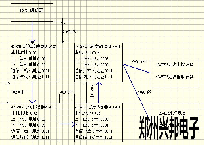 2、一個433MHZ無線通信器(WLA001)的無線覆蓋范圍為直經400米(空曠地區);只要在收發的范圍內,可連接的終端設備的臺數理論上沒有限制;地址號9998、9999,終端設備不可用,系統使用;