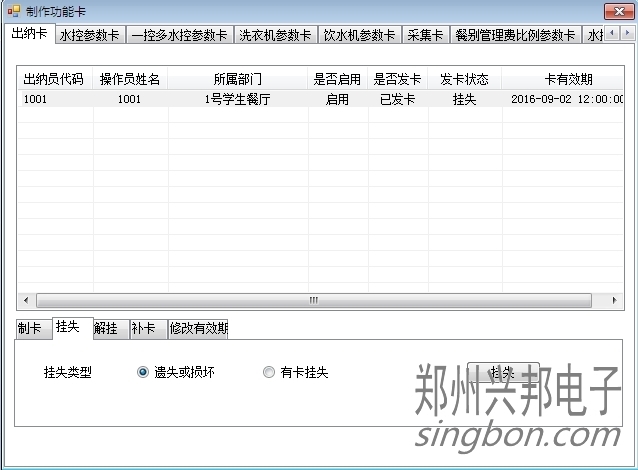 客戶使用的我們的互聯網一卡通食堂售飯機軟件,不小心把出納卡制成員工卡使用了,遇到這種情況,(1)用超級管理員身份登錄軟件,在軟件的制卡中心-功能卡制作-出納卡頁面里選中之前的出納員信息,選擇掛失(掛失類型選擇遺失或損壞),點擊右邊的掛失把原來的出納員賬號掛失;