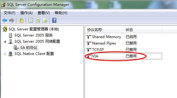 4、打開SQL Server 2005中的配置工具SQL Server Configure Manager,將VIA協議禁用