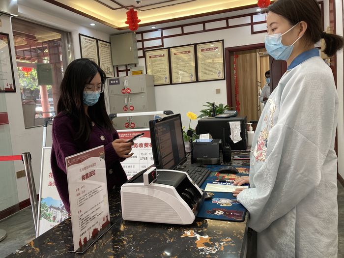 亳州市花戲樓景區售票處,江蘇游客正在刷社??ㄙ徺I門票。 劉景俠攝